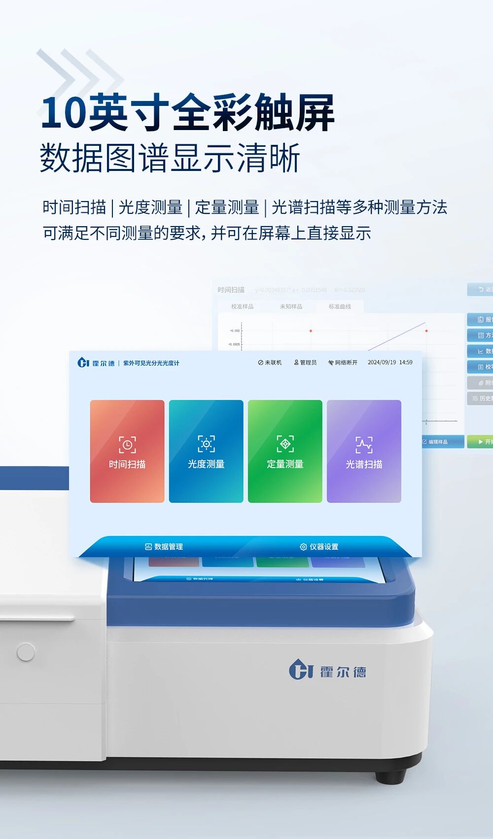 11. 单机功能丰富,时间测量(动力学测量)、光度测量、定量测量、光谱扫描、多波长测试等多种测量方法,可满足不同测量的要求,并可在屏幕上直接显示。