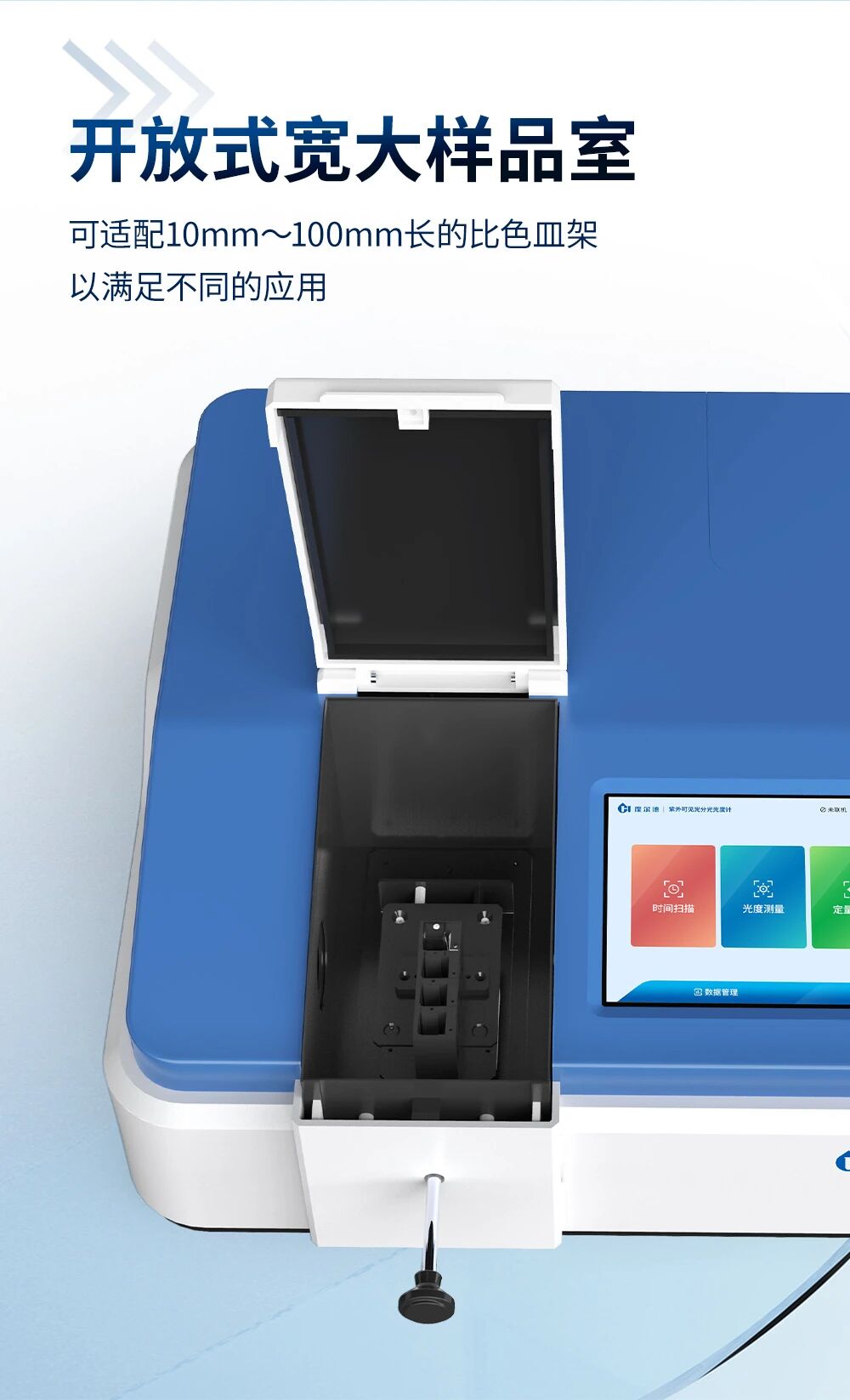 12. 开放式宽大样品室,可适配10mm~100mm长的比色皿架,以满足不同的应用。