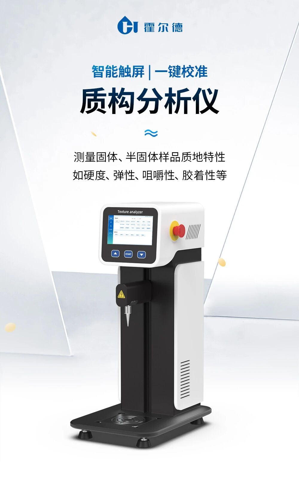 霍尔德•电子HD-TA1质构分析仪又称物性测试仪,是用于测量固体、半固体样品质地特性,如硬度、弹性、咀嚼性、胶着性等的专业仪器。通过模拟人体口腔咀嚼、手指触摸等动作,量化分析样品的物理力学性能,为食品、药品、化妆品等产品的品质控制、配方研发及货架期评估提供科学依据,助力生产工艺优化与产品质量提升。